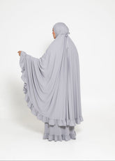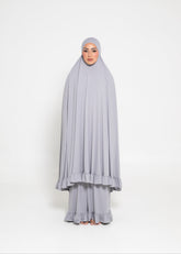 Designed for comfort and ease during prayer, the Selah Frill Set includes a jilbab and skirt crafted from a soft, buttery knit fabric. Thoughtfully designed for long prayers, it offers modest coverage with effortless wear.